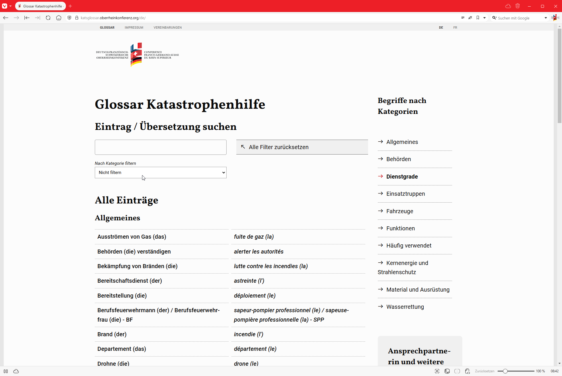 Kommunikation und gegenseitiges Verstehen ist essenziell - vor allem im Katastrophen- oder Krisenfall, wenn es auf jede Minute ankommt. Die Arbeitsgruppe Katastrophenhilfe der Deutsch-Französisch-Schweizerischen Oberrheinkonferenz hat daher schon vor längerer Zeit ein umfassendes Glossar erarbeitet, das wichtige Begriffe aus verschiedenen Bereichen jeweils zweisprachig aufbereitet hat. Als statisches PDF zum Herunterladen erwies sich dieses Dokument allerdings als mässig praktisch im Alltagsgebrauch.