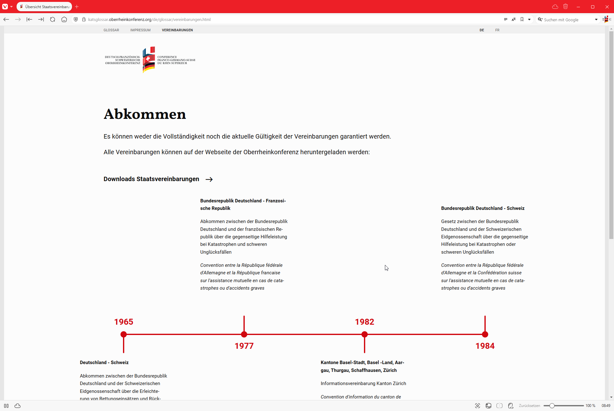 Zusätzlich steht das Glossar auch als PDF zum Download zur Verfügung, jeweils auf Deutsch und auf Französisch. Die Aktualisierung der PDF-Version kann dabei durch das Redaktionsteam vorgenommen werden. Eine animierte Übersicht der grenzüberschreitenden Vereinbarungen zur Katastrophenhilfe im zeitlichen Verlauf rundet das Projekt ab.