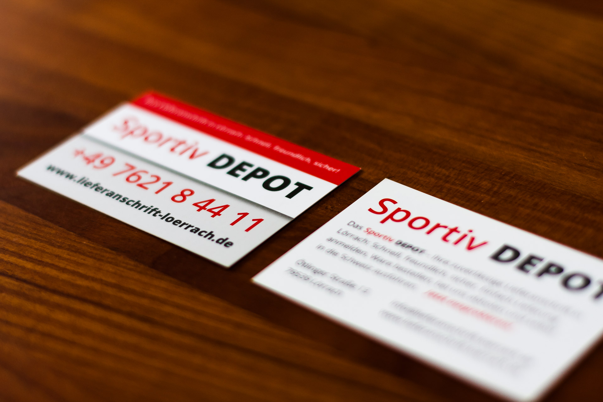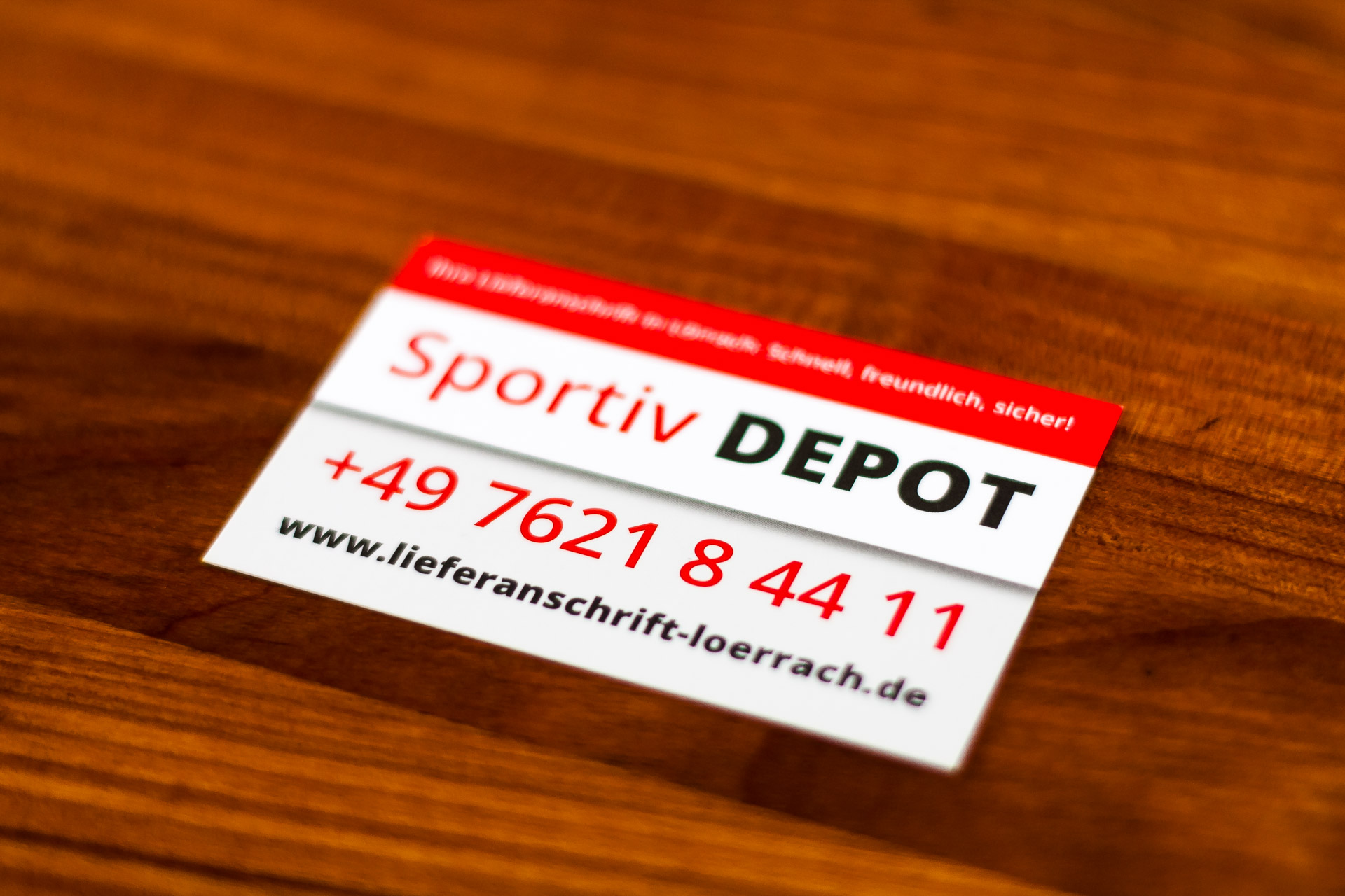 Das Sportiv DEPOT fungiert als kostengünstige Lieferadresse - vor allem Schweizer Kunden nehmen diesen Service gerne in Anspruch, wenn ein Online-Händler nicht in die Schweiz liefert oder nur zu unverhältnismässig hohen Kosten. Die cellophanierten Visitenkarten überzeugen durch eine angenehme Haptik. In den Hausfarben gehalten, hält die Karte alle relevanten Informationen auf einen Blick bereit und informiert zudem über Angebot und Ablauf des Verfahrens. Über die dazugehörige Webseite können Interessenten direkt ihren Lieferauftrag anmelden.