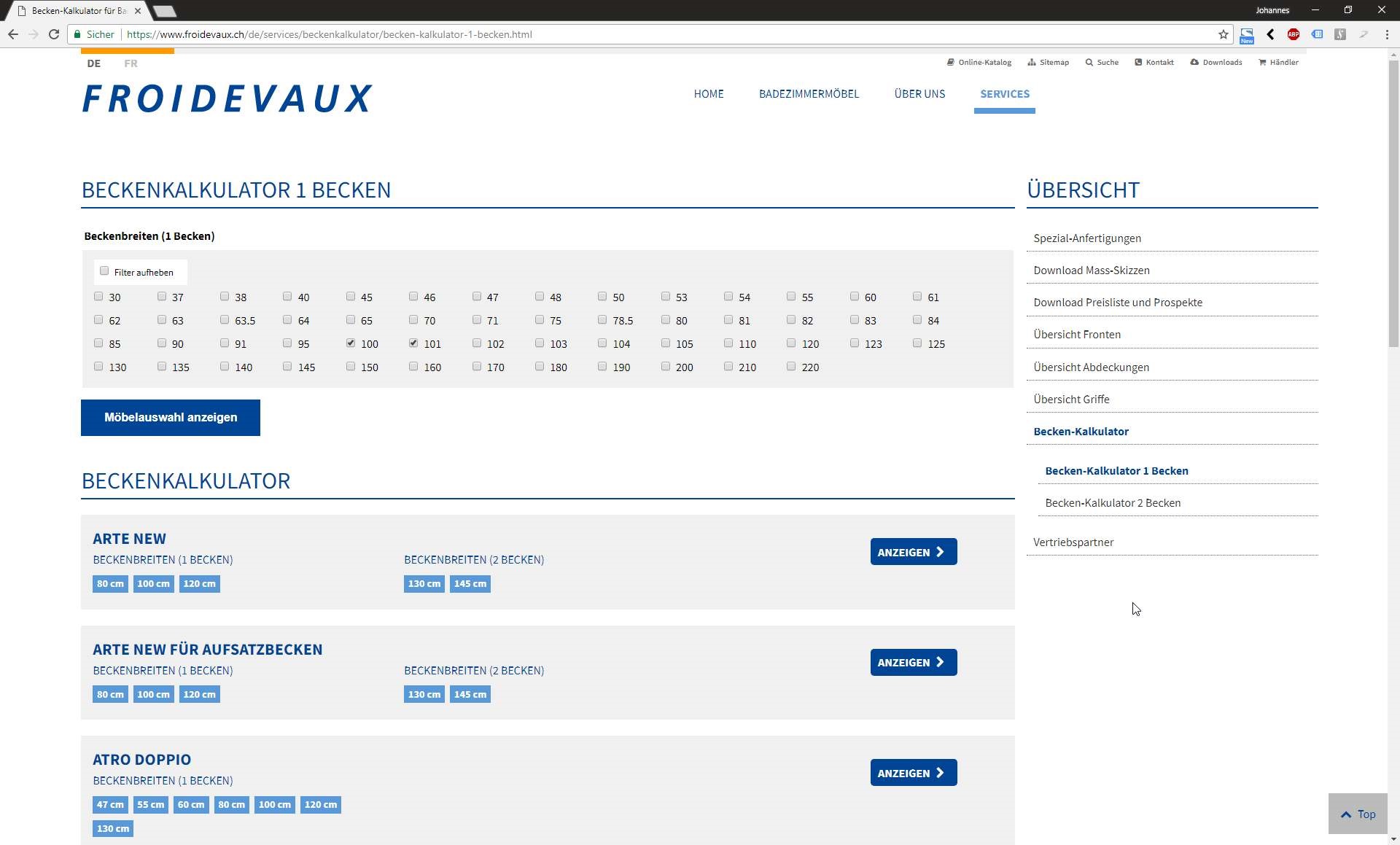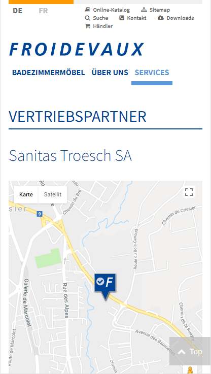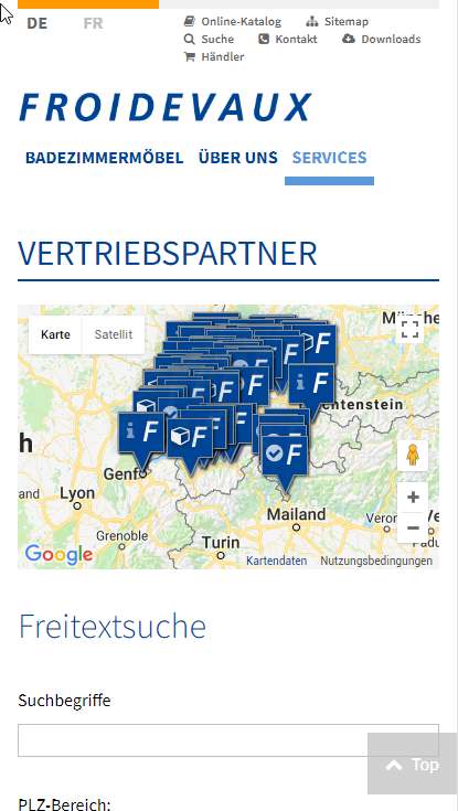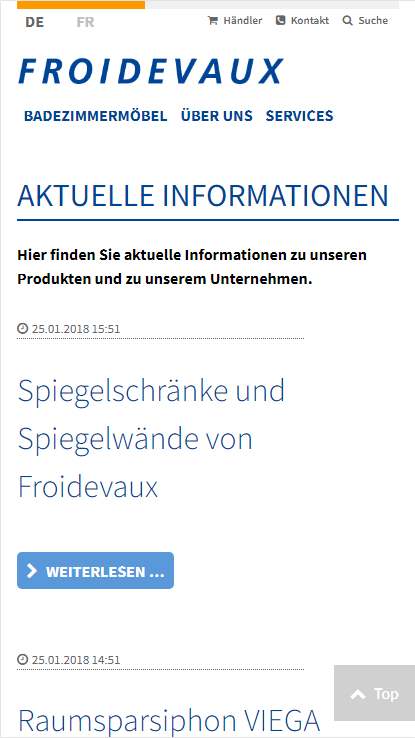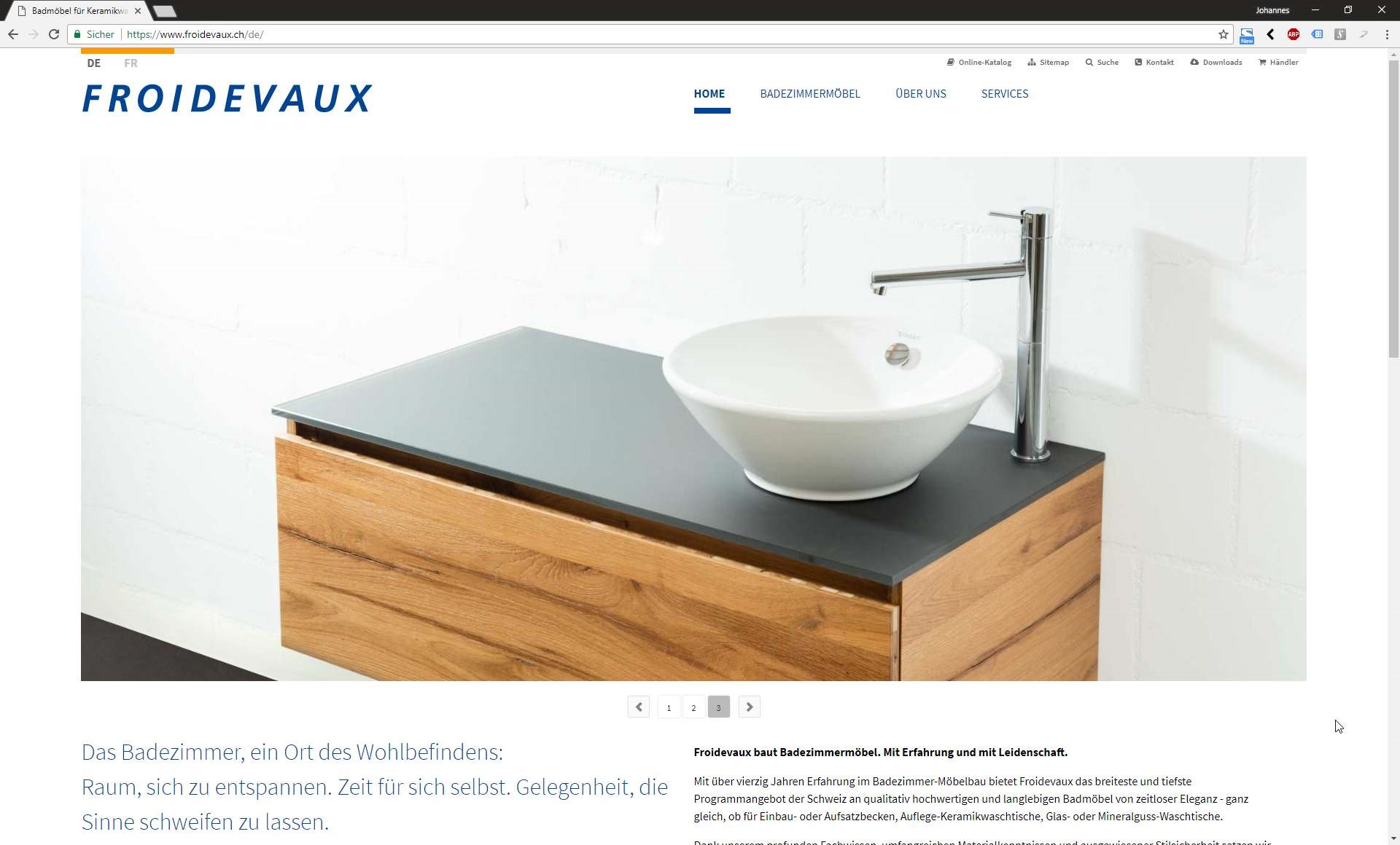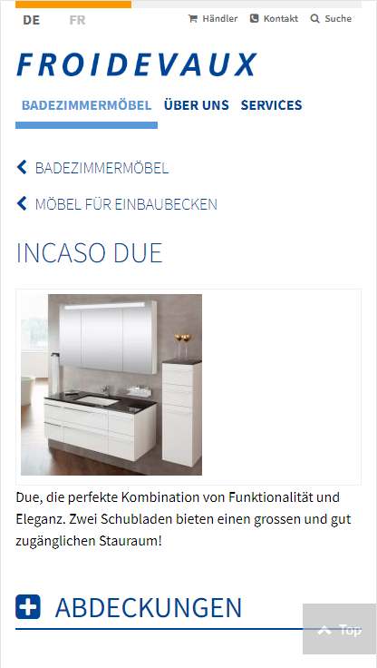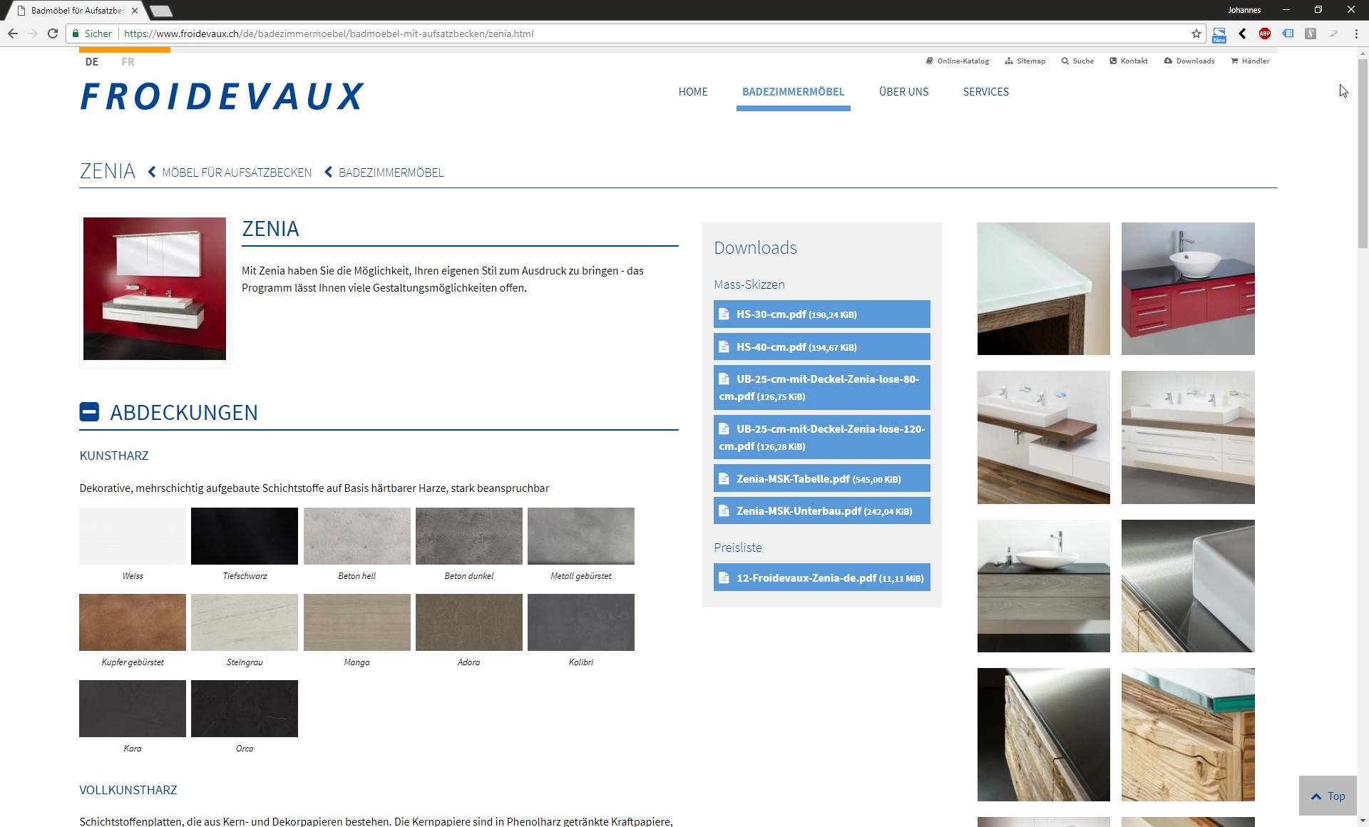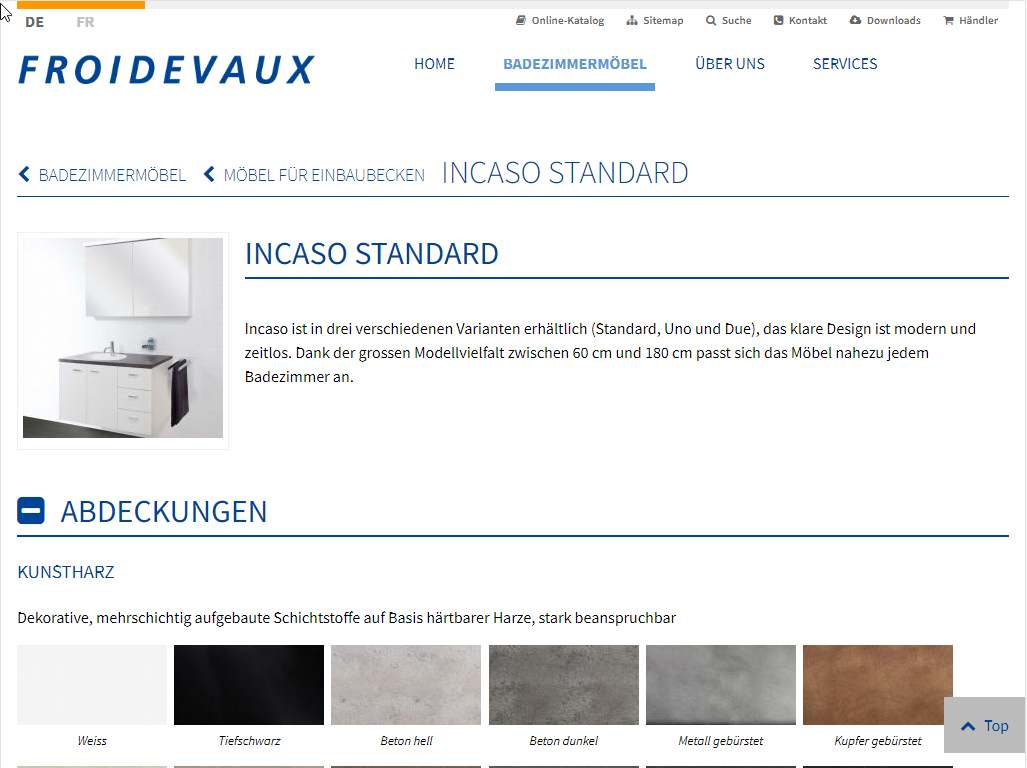 Dank der MetaModels-Erweiterung für Contao kann die Firma Froidevaux mit dem auf Contao basierenden Internet-Auftritt nun ihr komplettes Programm an Badezimmermöbeln komfortabel und flexibel, mehrsprachig und inkl. zugehöriger Dokumente (Mass-Skizzen, Preislisten etc.) verwalten. Der mehrsprachig gestaltete, responsive Auftritt präsentiert damit umfassend alle Froidevaux-Badezimmermöbel mit den möglichen Programmen, Farben, Abdeckungen, Griffen etc.