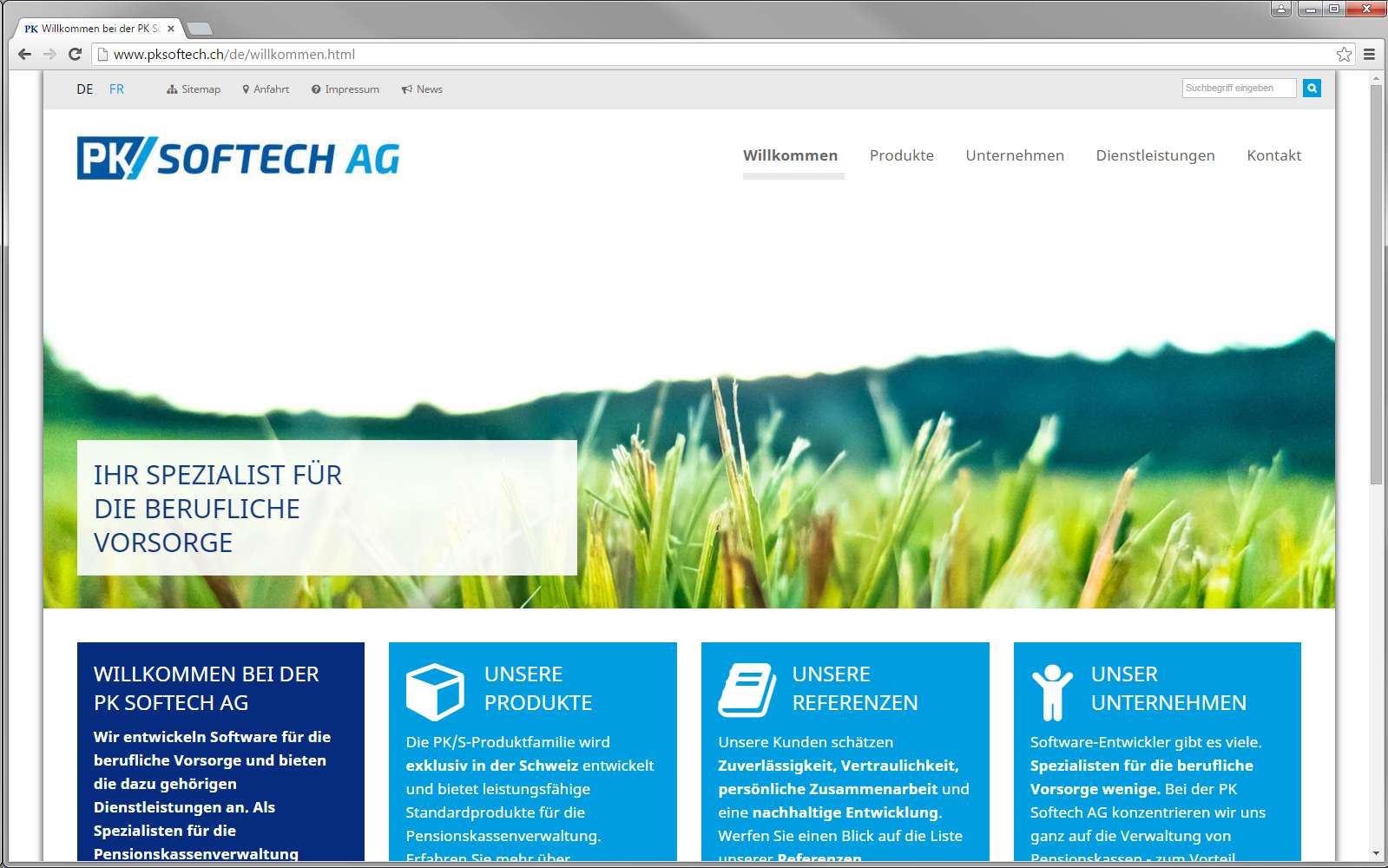 Der 2010 erstellte und seitdem kontinuierlich betreute Internet-Auftritt informiert Interessenten und Kunden über die verschiedenen Produkte und Dienstleistungen der PK Softech AG zur Verwaltung von Pensionskassen.